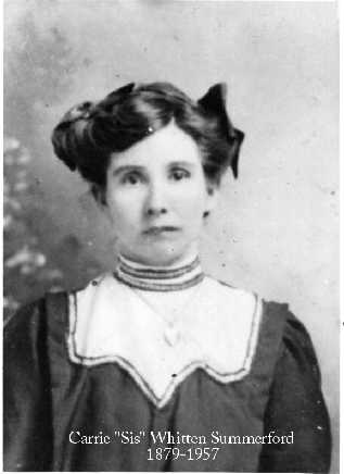 Pete Whitten, son of Ed Whitten, remembered his aunt "Sis", Carrie Whitten, as being the oldest girl born to John Thomas and Sue Whitten. According to Pete, she married a man named Summerford, but they lived together only a few weeks. She also had a premature baby that was so small that the family buried it in a shoe box in Noxubee Hill Cemetery. Pete did not remember his Aunt Sis very fondly. "She was as mean an old witch as there ever was. She would just as soon pick up a hoe and chop your head off that to look at you. At times, you could not ask her to be no better, but then she could get mad at you and be just like a witch." Sis lived with her sister Della and her family in the Mississippi Delta before dying there in 1957.